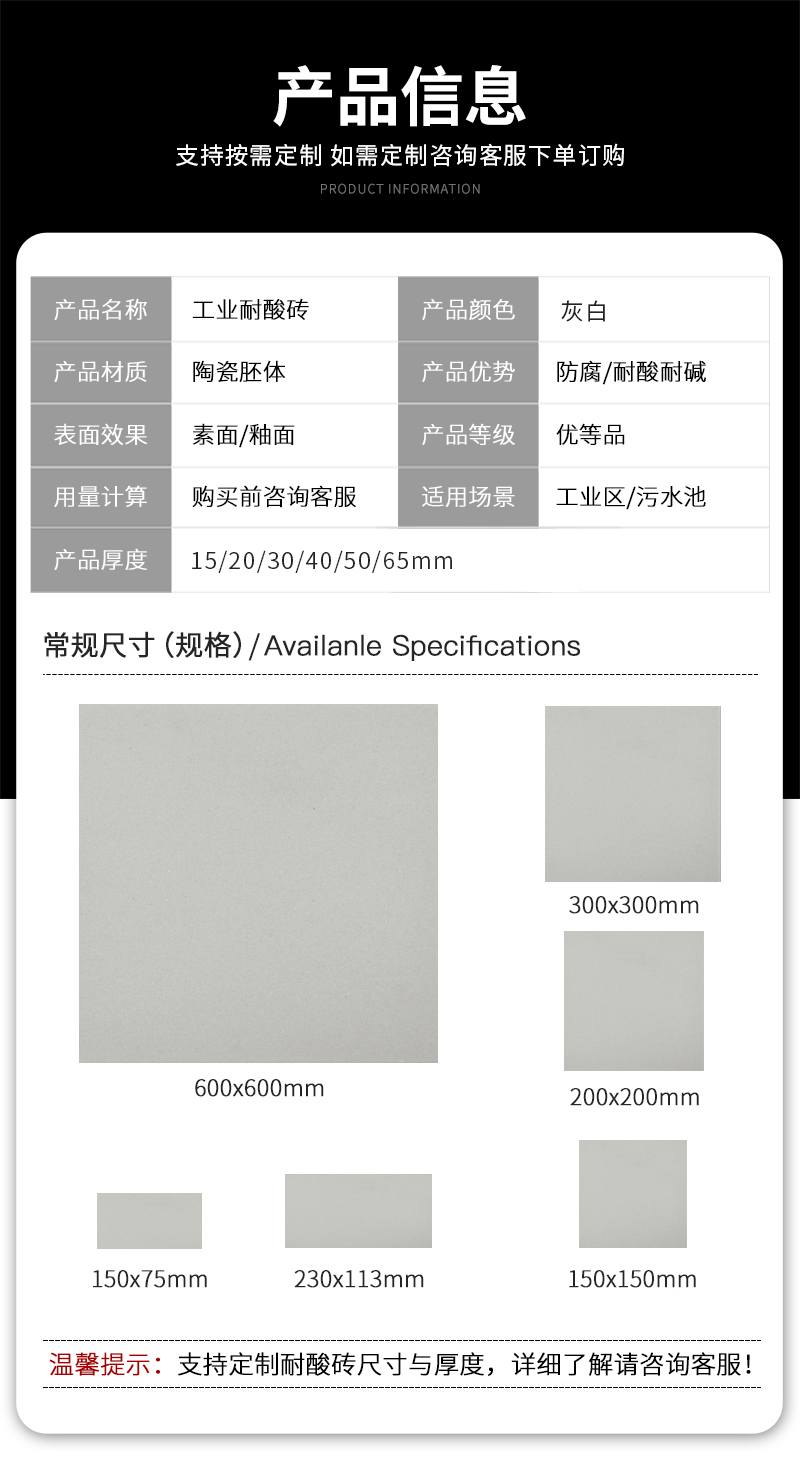 40厚耐酸磚目前只有一種230*113*40,耐酸磚價格在160元一平方, 耐酸磚厚度大小不一樣,價格錯的也挺多的,比如150*150*15mm,200*200*15mm,300*300*15mm的價格是比較便宜的(45-50元) ,上圖